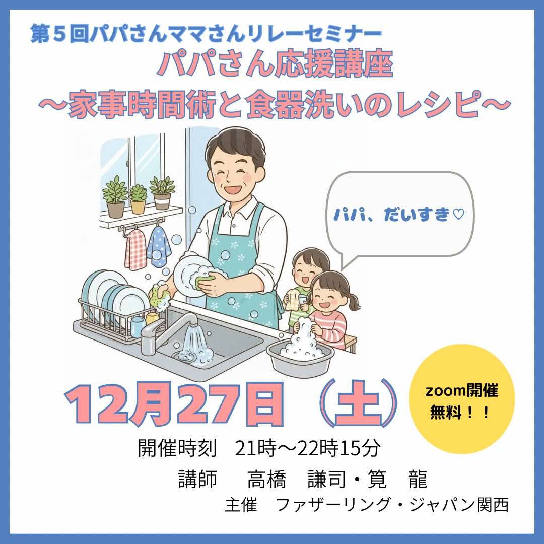 - テーマ:「家事・育児の「できてない」を「できる」に変える30分 ~家族の絆を深めるパパさんのための家庭参画時間術~」