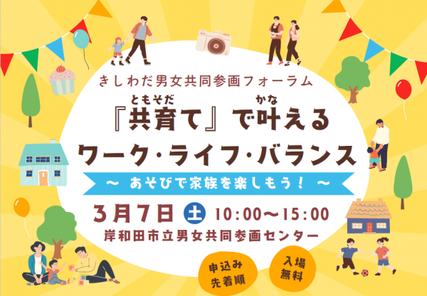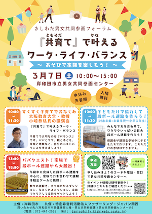 3月7日(土)、岸和田市立男女共同参画センターにて「共育て」をテーマにした特別なフォーラムを開催いたします。 ご家族皆さまで楽しめる盛りだくさんの内容です。