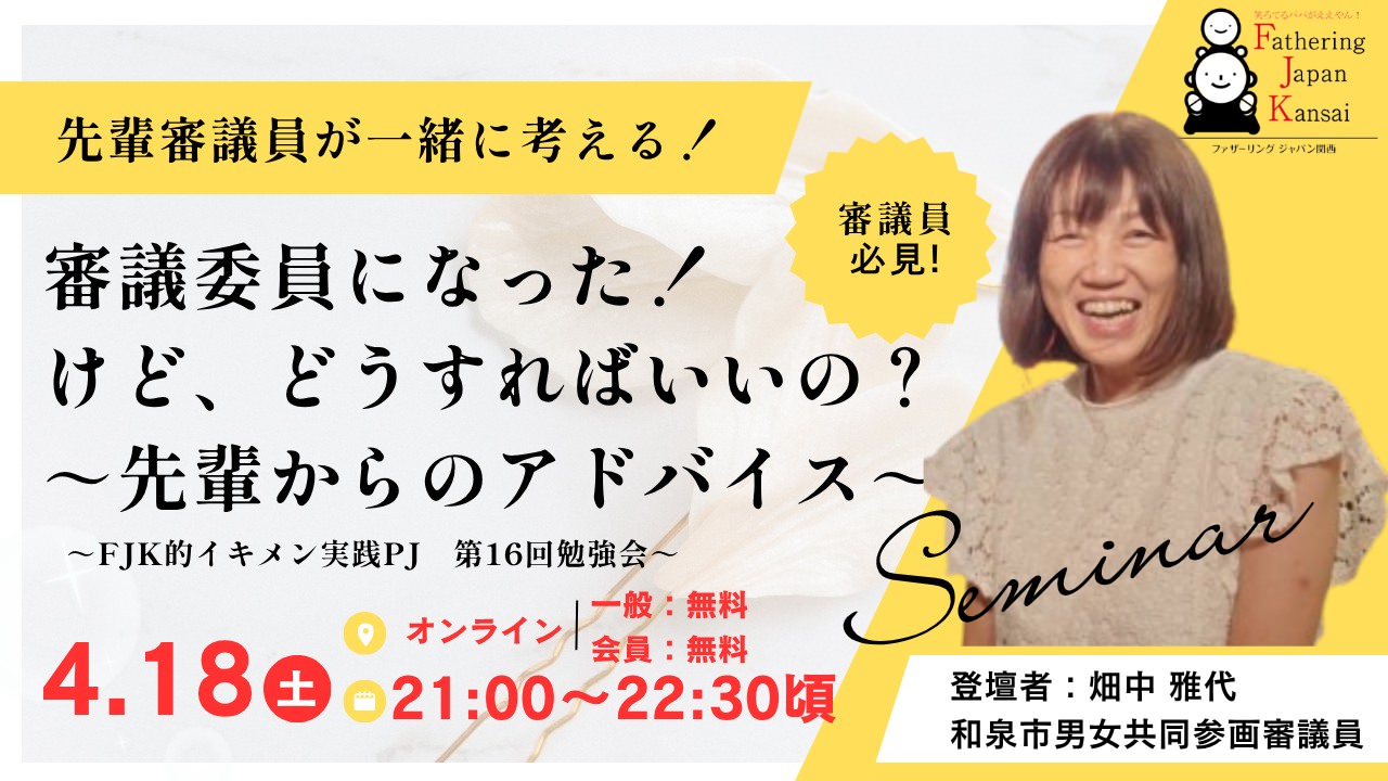 行政機関の審議会を「地域のアツい住民と繋がれる場」として捉え、地域課題に目覚めた「イキメン」が、「審議会の『市民公募枠』を利用し参画」することで、「地域貢献」、「自身の成長」の機会を得て、そして実践することで、「より良い地域を次世代に残す」(サステナブル)ことを目的とするファザーリング・ジャパン関西の全国プロジェクトです!